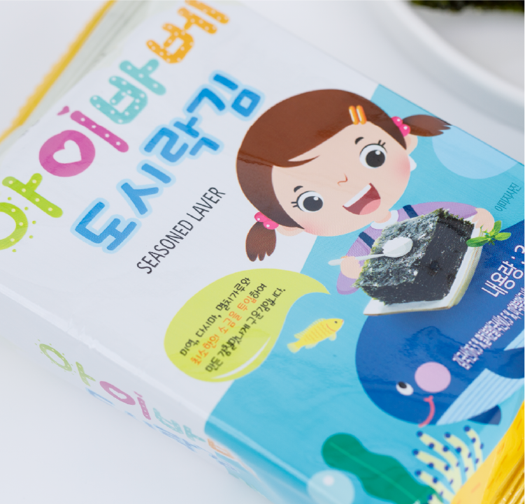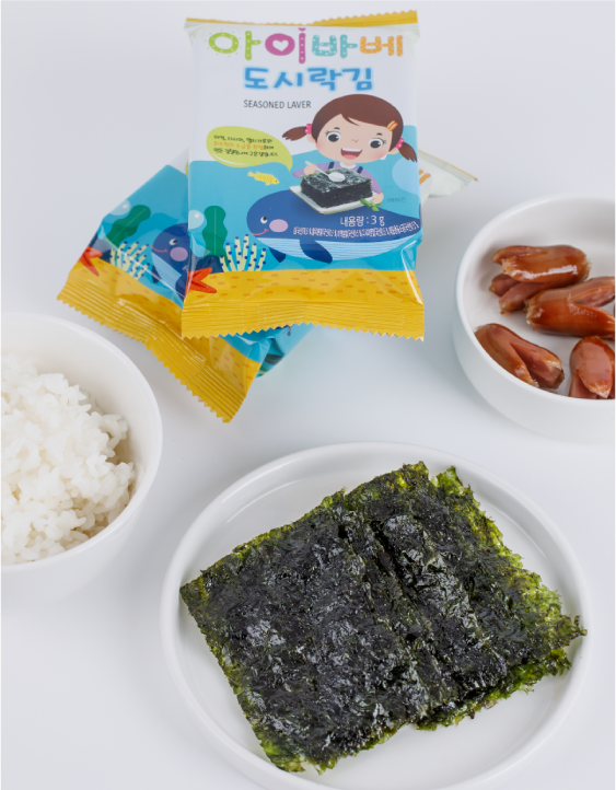 김(국산)76.5%, 카놀라유(외국산:이탈리아, 프랑스, 캐나다 등/유기농)14%, 참기름 (참깨:국산)3.5%, 들기름(들깨:국산)4%, 태움용융소금(국산)0.5%, 멸치분말(국산) 0.5%, 미역분말(국산)0.5%, 다시마분말(국산)0.5%